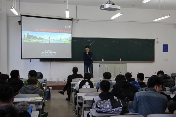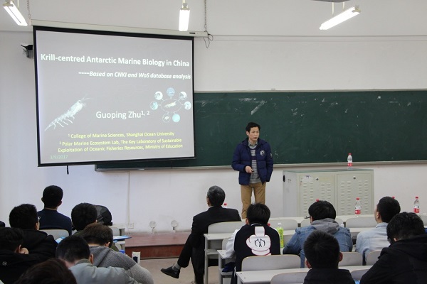 讲座共分为四个环节,第一环节由许柳雄教授做关于金枪鱼围网渔具沉降性能研究的报告;第二环节由张硕副教授就海州湾海洋牧场研究发展概况进行解读;第三环节由李云凯副教授展示稳定同位素技术在海洋生物学中的应用;第四部分为朱国平副教授介绍南极海洋生物研究进展。