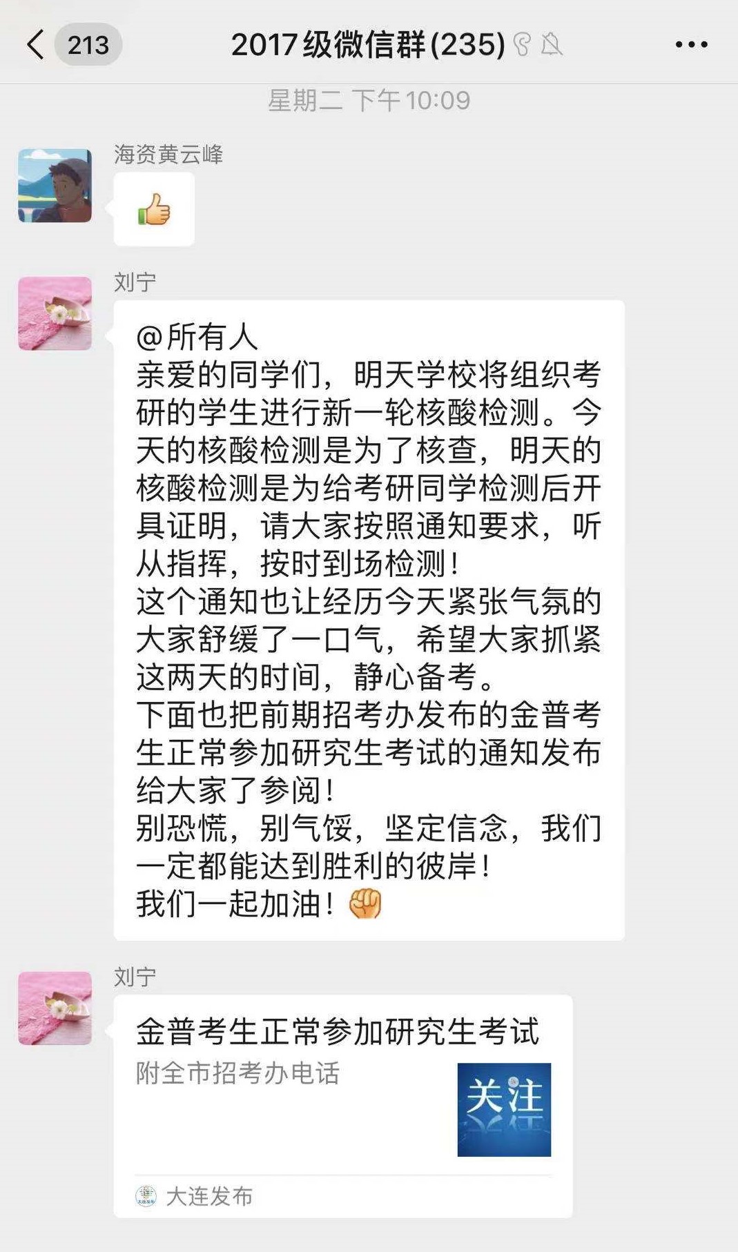 终于考研宝宝们盼来了惊喜的好消息,学校专门为他们组织核酸检测,上级决定专门在我校设立考点,峰回路转,宝宝们都可以考试了!