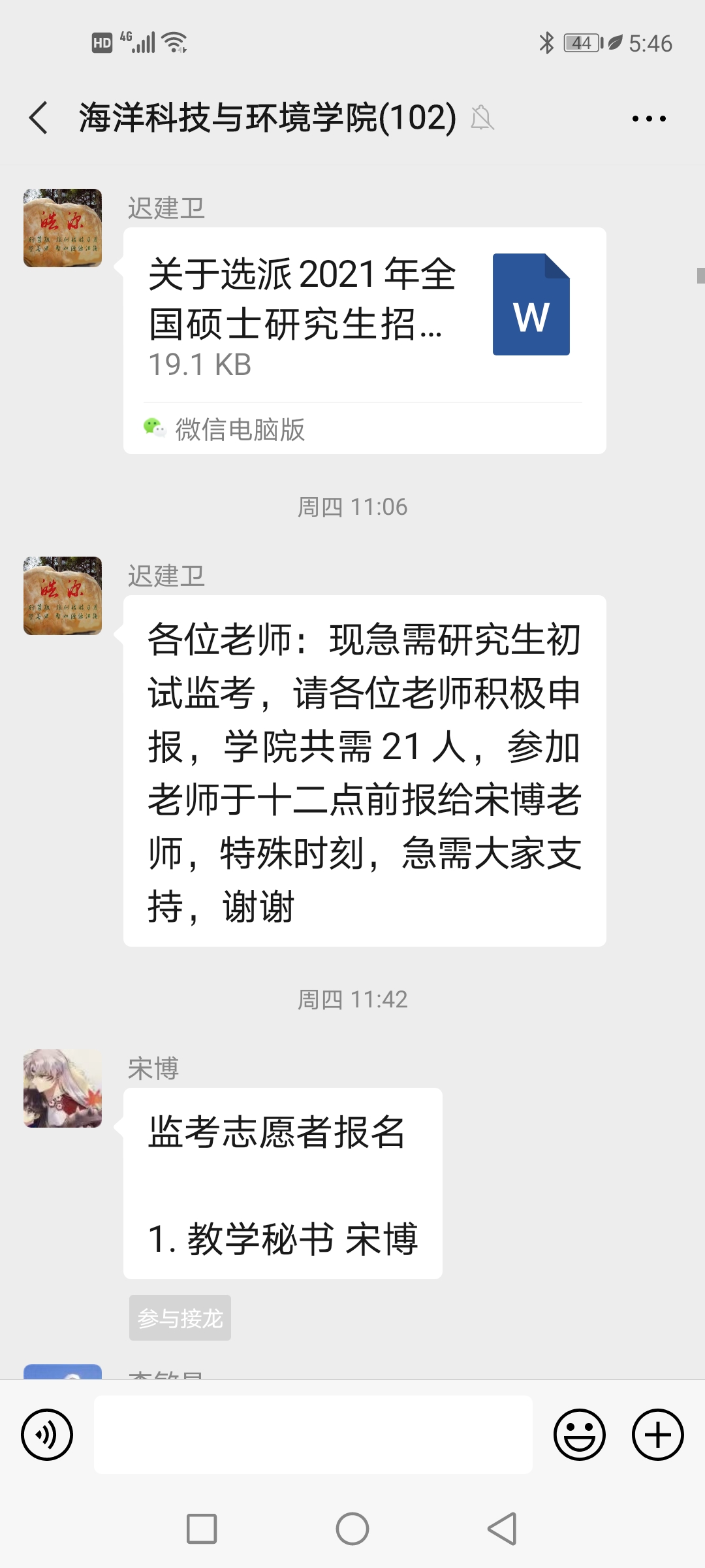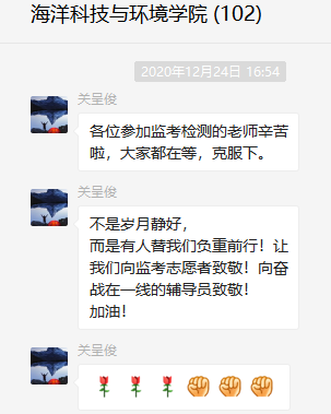 为新考点选派监考志愿者的通知发布不到一个小时,学院就有25位老师积极报名,在隔离考场志愿者招募中有5位老师报名,这就是顾全大局,主动担当的海环精神,表扬信走起!