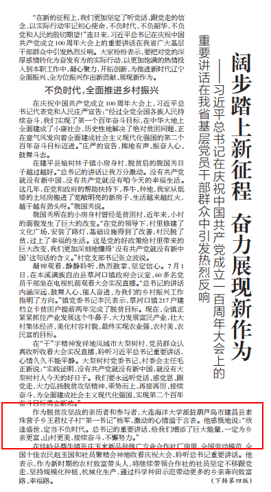 7月4日,《辽宁日报》头版以“阔步踏上新征程 奋力展现新作为——习近平总书记在庆祝中国共产党成立一百周年大会上的重要讲话在我省基层党员干部群众中引发热烈反响”为题,报道了我校派驻建昌县素珠营子乡王君杖子村第一书记杨军同志(太阳集团tyc234cc)收看习近平总书记重要讲话的感想。