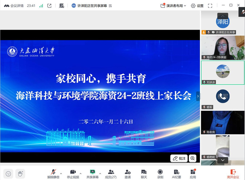 1月26日,我院在腾讯会议召开海洋资源与环境专业24级二班线上家长会。对接班级联系教师校团委负责人刘冰冰、学院党委副书记李建伟、副院长杨军、团委书记许泽阳、海资24级二班全体学生及家长参加本次会议。